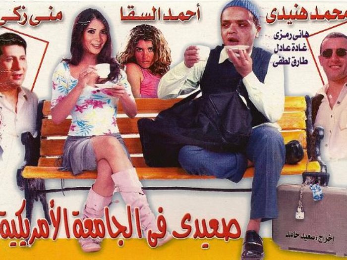 فيلم “صعيدي في الجامعة الأمريكية” من بطولة: محمد هنيدي، ومنى زكي، وغادة عادل، وهاني رمزي، وأحمد السقا، وطارق لطفي، وفتحي عبد الوهاب، وأميرة فتحي، ومن تأليف مدحت العدل وإخراج سعيد حامد.