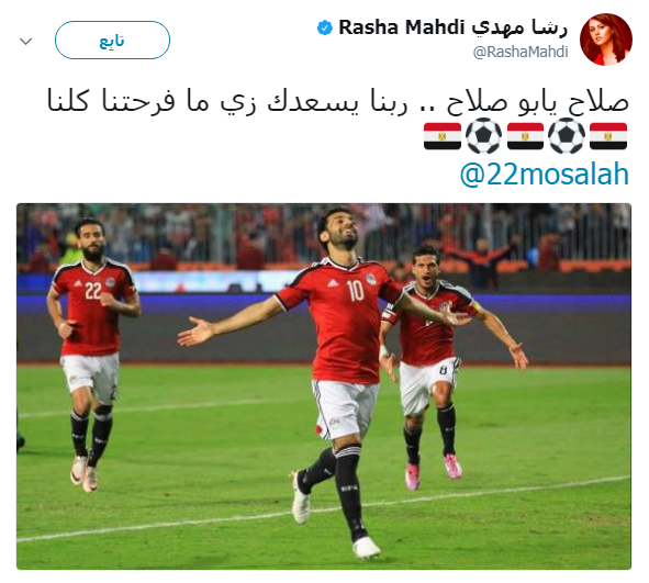 وعلقت الفنانة رشا مهدي عبر صفحتها الرسمية على موقع “تويتر”، على فوز الفراعنة قائلة: “ألف مبروك لمصر وياللا الحلم قرب.. مصر لكأس العالم إن شاء الله وألف مبروك للسعودية أول الواصلين شرفتونا”.