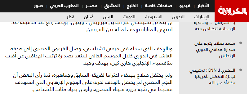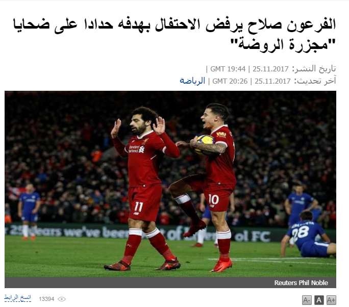 بينما تحدثت شبكة “سي إن إن” عن صلاح، قائلة: “النجم المصري لم يحتفل بالهدف لحزنه على الهجوم الإرهابي الذي استهدف مسجدًا في شبه جزيرة سيناء وأودى بحياة مئات الأشخاص”.