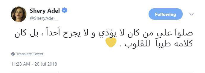 وكانت شيري عادل قد كتبت تدوينة وحيدة على حسابها وهي: “صلوا علي من كان لا يؤذي و لا يجرح أحداً ، بل كان كلامه طيباً للقلوب”.