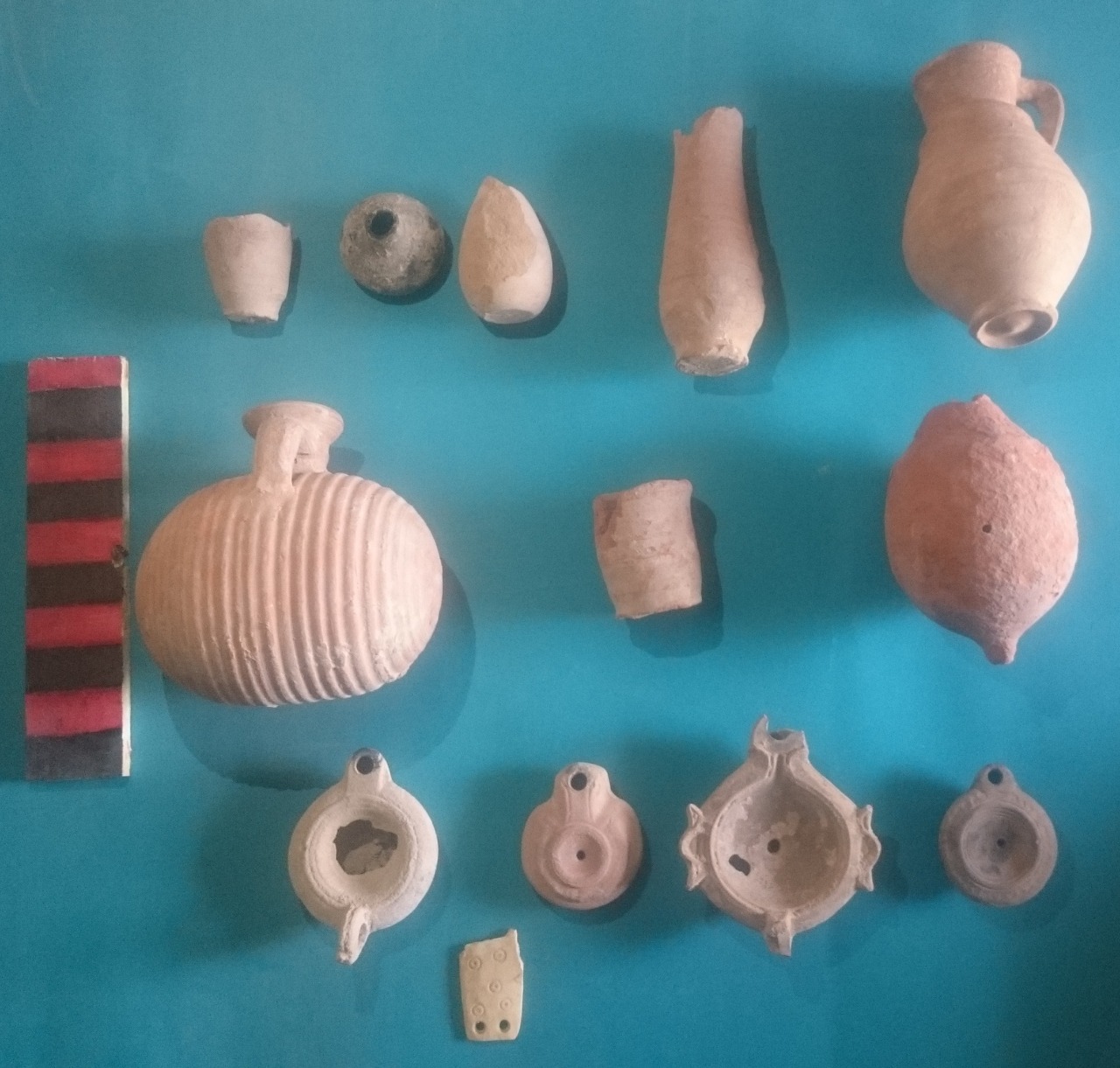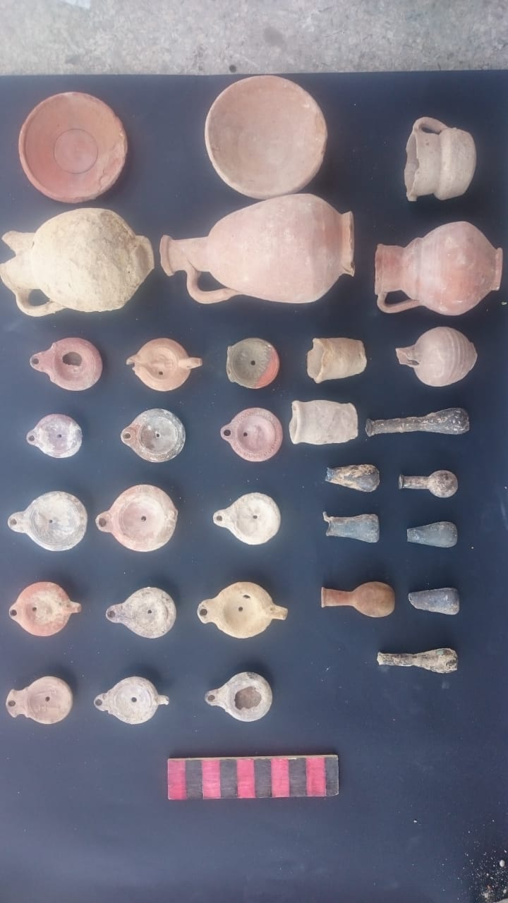 ولفت إلى أنه تم العثور أيضا على العديد من أواني المائدة التي كان يستخدمها أهل المتوفى وقت الزيارة، بالإضافة إلى مسارج للإضاءة عليها زخارف مميزة منها حيوانات تأكل أو ترضع صغارها وأواني زجاجية وفخارية عثر عليها في الدفنات كقرابين مع المتوفى وأمفورات للدفن، بالإضافة إلى قطع دائرية من الفخار عليها زخارف بارزة لبعض فتيات ربما راقصات، وهياكل عظمية في حالة فوضى بسبب ما تعرض له الموقع من تدمير فى ثلاثينات القرن الماضي أثناء عمل السكة الحديد على يد الإنجليز وفيما بعد بسبب غارات الحرب العالمية الثانية.