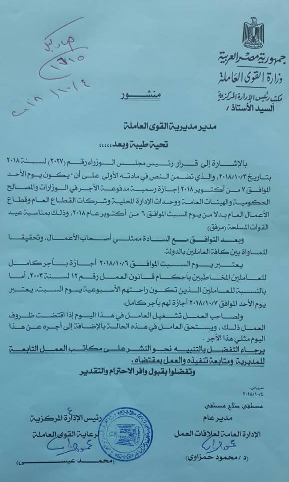 أعلن وزير القوي العاملة محمد سعفان، أنه بعد التوافق مع ممثلي أصحاب الأعمال وتحقيقا للمساواة بين كافة العاملين بالدولة، بمناسبة عيد القوات المسلحة، يعتبر السبت الموافق 6 أكتوبر 2018 إجازة بأجر كامل للعاملين المخاطبين بأحكام قانون العمل.