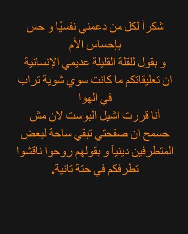 وتابعت: «أنا قررت أشيل البوست لأن مش هسمح إن صفحتي تبقى ساحة لبعض المتطرفين دينياً، وبقول روحوا ناقشوا تطرفكم في حتة تانية».