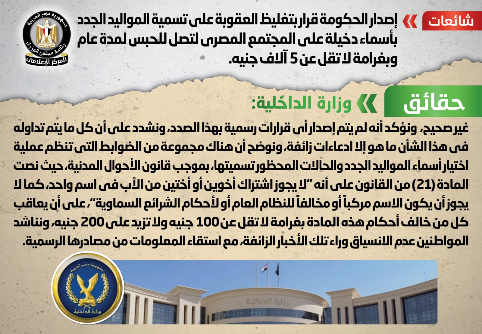 وقال المركز إن بعض المواقع الإلكترونية وصفحات التواصل الاجتماعي تداولت أنباء تزعم إصدار الحكومة قرار بتغليظ العقوبة على تسمية المواليد الجدد بأسماء دخيلة على المجتمع المصري لتصل للحبس لمدة عام وبغرامة لا تقل عن 5 آلاف جنيه، وقد قام المركز الإعلامي لمجلس الوزراء بالتواصل مع وزارة الداخلية، والتي نفت تلك الأنباء، مؤكدةً أنه لا صحة لتغليظ العقوبة على تسمية المواليد الجدد بأسماء دخيلة على المجتمع المصري لتصل للحبس لمدة عام وبغرامة لا تقل عن 5 آلاف جنيه، وأنه لم يتم إصدار أي قرارات رسمية بهذا الصدد.
