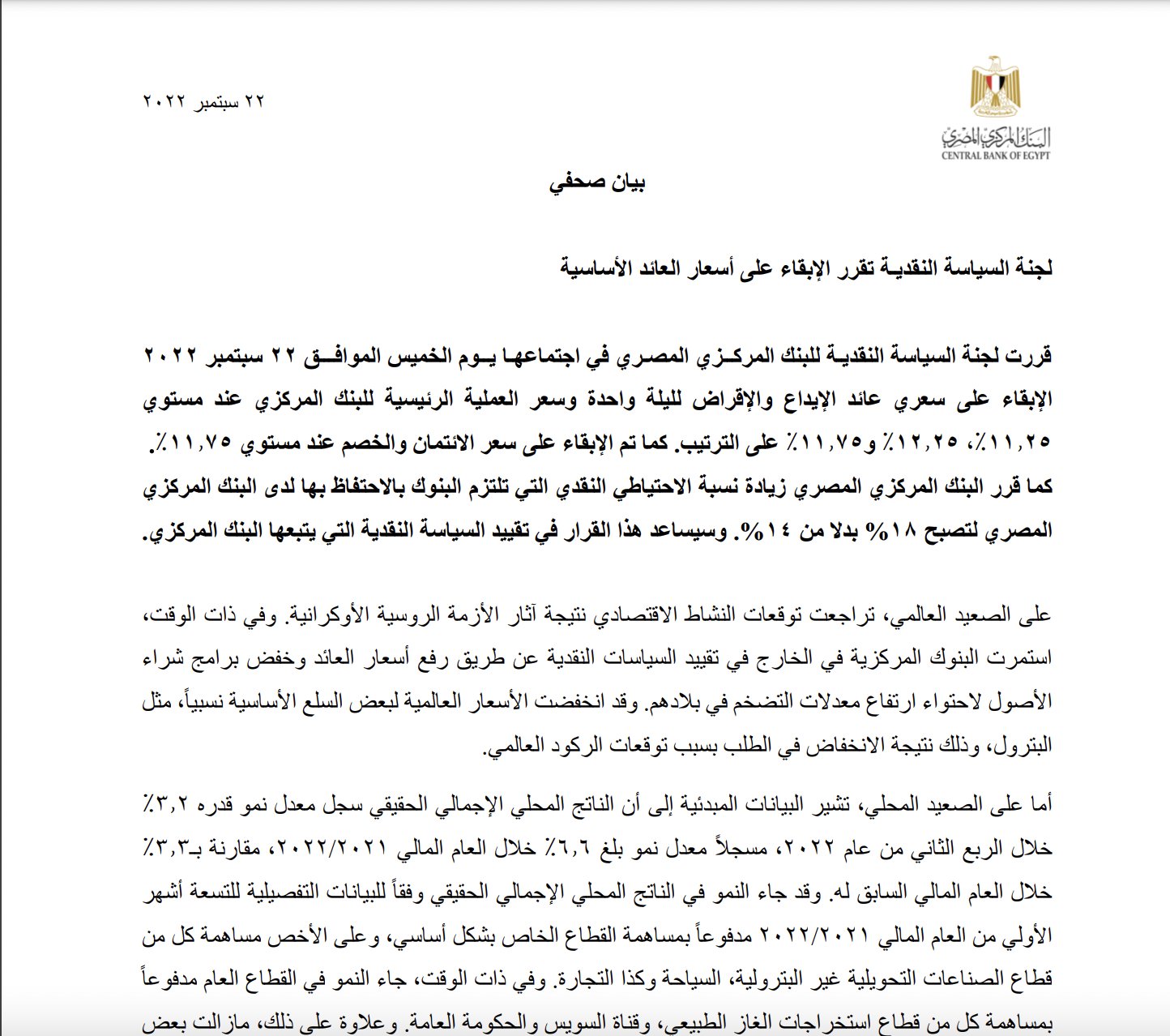 وقال بيان البنك المركزي: “قررت لجنة السياسة النقدية للبنك المركزي المصري في اجتماعهـا يـوم الخميس الموافق 22 سبتمبر 2022 الإبقاء على سعري عائد الإيداع والإقراض لليلة واحدة وسعر العملية الرئيسية للبنك المركزي عند مستوي ٪۱۱٫۲۵، ٪۱۲٫۲۵ وه ۱۱٫۷٪ على الترتيب. كما تم الإبقاء على سعر الائتمان والخصم عند مستوي ١١،٧٥٪. كما قرر البنك المركزي المصري زيادة نسبة الاحتياطي النقدي التي تلتزم البنوك بالاحتفاظ بها لدى البنك المركزي المصري لتصبح ۱۸ % بدلا من 14%. وسيساعد هذا القرار في تقييد السياسة النقدية التي يتبعها البنك المركزي”.