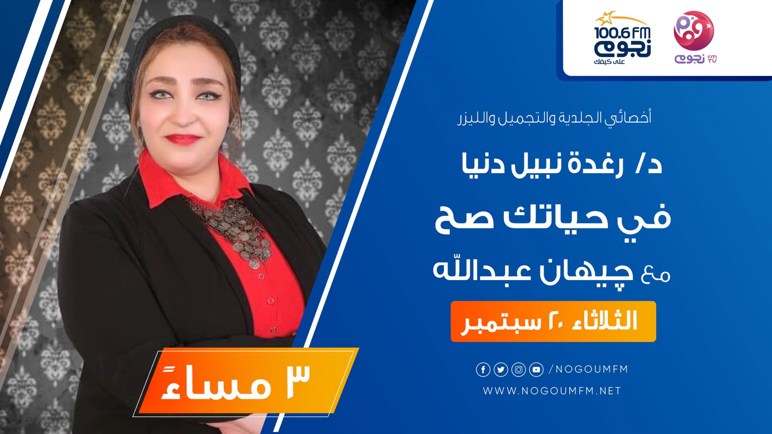 تستضيف جيهان عبد الله في برنامج «حياتك صح» على «نجوم إف إم»، اليوم الثلاثاء، الدكتورة رغدة نبيل دنيا، أخصائي الجلدية والتجميل والليزر، والدكتور أحمد السبكي، أستاذ جراحات السمنة والسكر كلية طب عين شمس.
