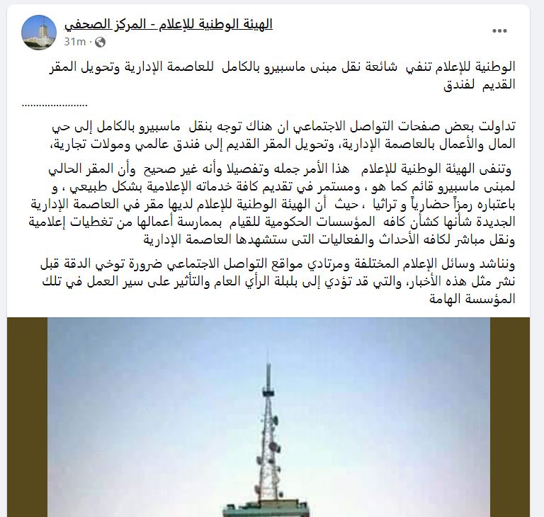 ونفت الهيئة الوطنية للإعلام، في بيان صحفي، هذا الأمر جملة وتفصيلا وأنه غير صحيح وأن المقر الحالي لمبنى ماسبيرو قائم كما هو، ومستمر في تقديم كافة خدماته الإعلامية بشكل طبيعي، باعتباره رمزا حضاريا وتراثيا.
