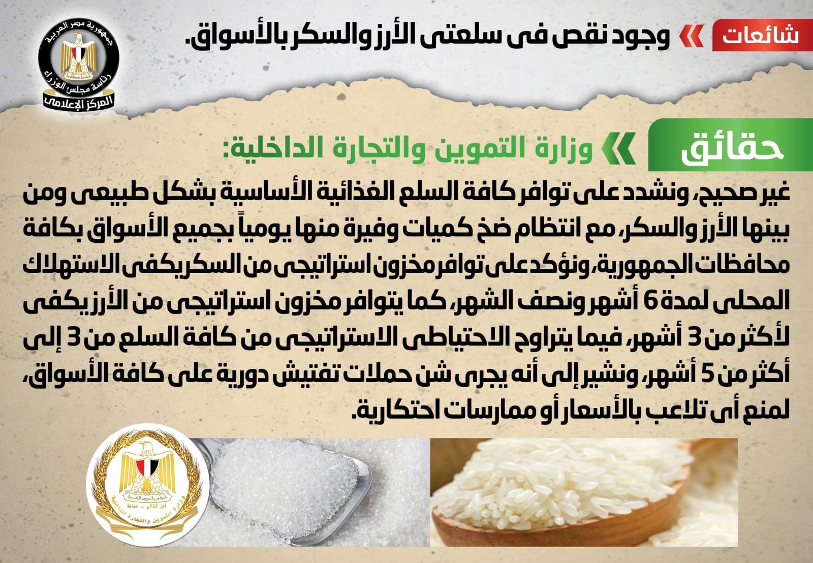 انتشرت في بعض المواقع الإلكترونية وصفحات التواصل الاجتماعي أنباء بشأن وجود نقص في سلعتي الأرز والسكر بالأسواق، وقد قام المركز الإعلامي لمجلس الوزراء بالتواصل مع وزارة التموين والتجارة الداخلية، والتي نفت تلك الأنباء، مُؤكدةً أنه لا صحة لوجود نقص في سلعتي الأرز والسكر بالأسواق، مُشددةً على توافر كافة السلع الغذائية الأساسية بشكل طبيعي ومن بينها الأرز والسكر، مع انتظام ضخ كميات وفيرة منها يومياً بجميع الأسواق بكافة محافظات الجمهورية، مشيرةً إلى توافر مخزون استراتيجي من السكر يكفي الاستهلاك المحلي لمدة 6 أشهر ونصف الشهر، كما يتوافر مخزون استراتيجي من الأرز يكفي لأكثر من 3 أشهر، فيما يتراوح الاحتياطي الاستراتيجي من كافة السلع من 3 إلى أكثر من 5 أشهر، مُشيرةً إلى أنه يجري شن حملات تفتيش دورية على كافة الأسواق، لمنع أي تلاعب بالأسعار أو ممارسات احتكارية.