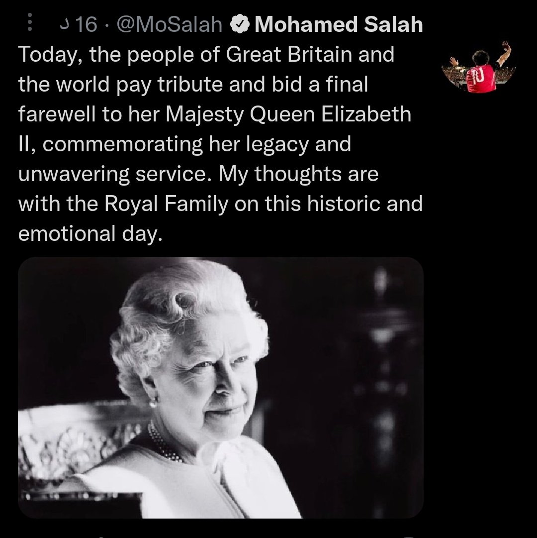 وقال محمد صلاح: “اليوم، يقوم شعب بريطانيا العظمى والعالم بتكريم وتوديع جلالة الملكة إليزابيث الثانية بشكل نهائي، إحياءً لذكرى تراثها وخدمتها التي لا تتزعزع، قلبي مع العائلة المالكة فى هذا اليوم التاريخي والعاطفي”.