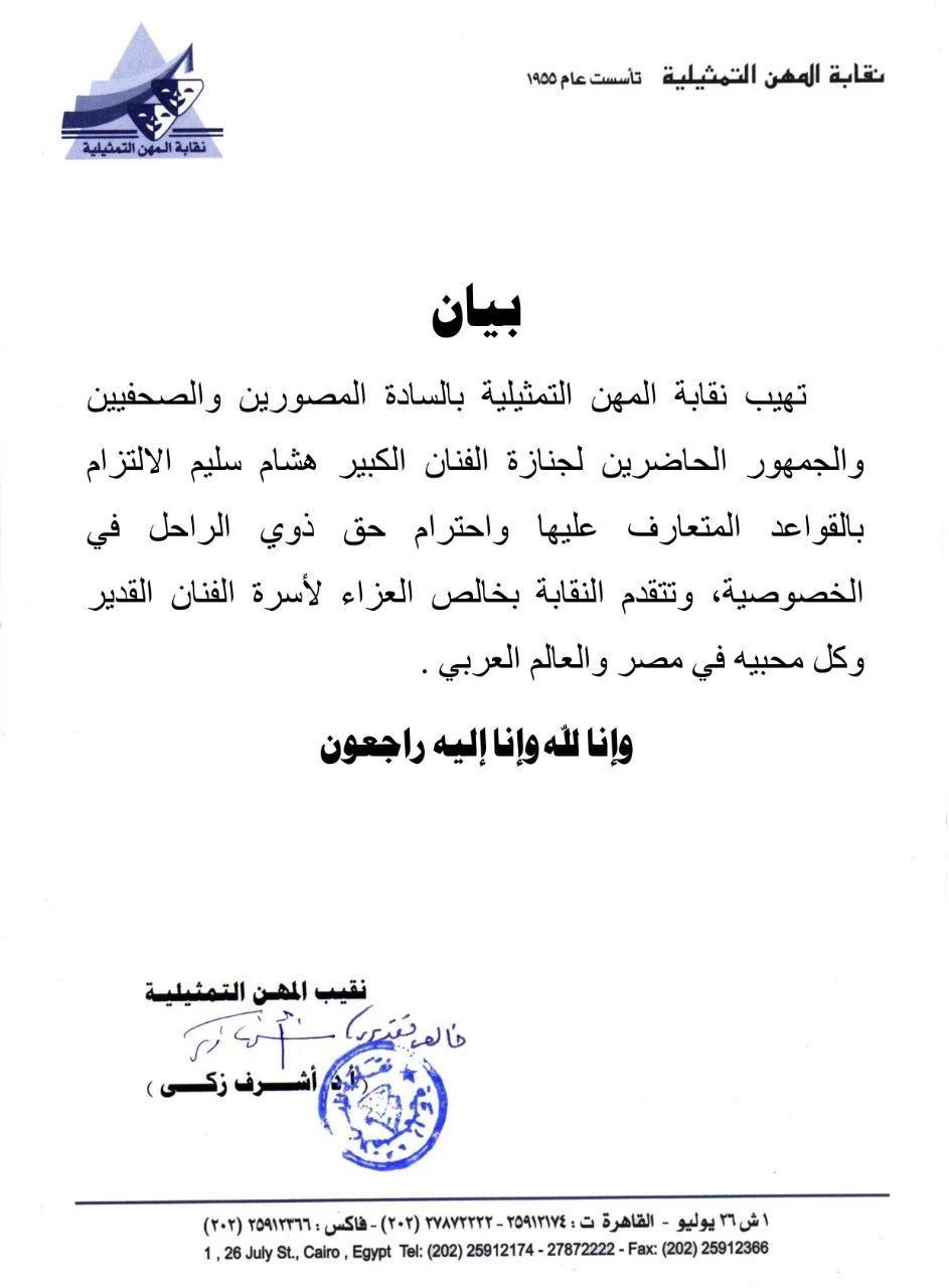 وأهابت النقابة في بيانها بالمصورين والصحفيين والجمهور الحاضرين لجنازة الفنان الكبير هشام سليم الالتزام بالقواعد المتعارف عليها واحترام حق ذوي الراحل في الخصوصية.