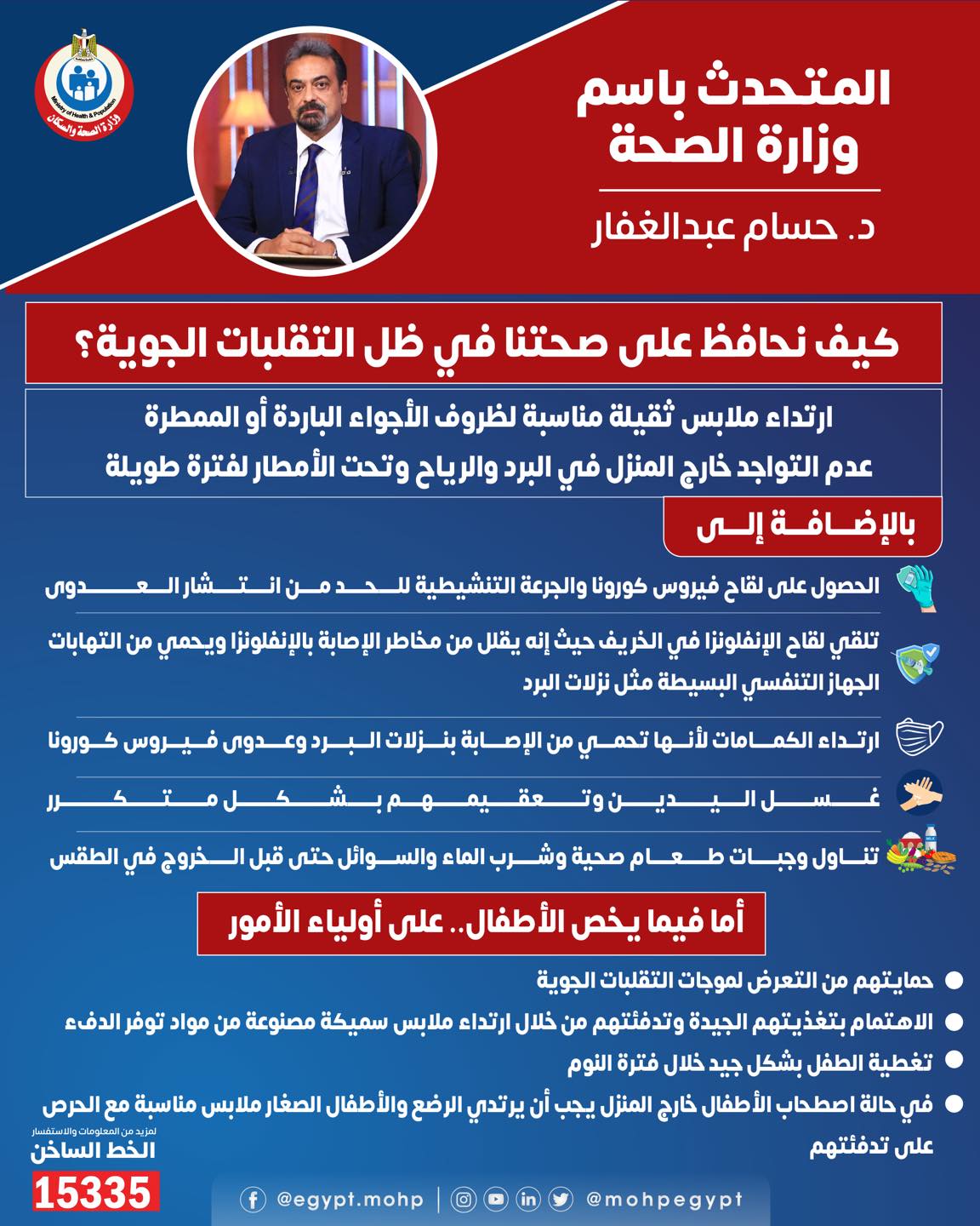 وأكد الدكتور حسام عبد الغفار المتحدث باسم وزارة الصحة، ضرورة ارتداء ملابس ثقيلة مناسبة لظروف الأجواء الباردة أو الممطرة، وعدم التواجد خارج المنزل في البرد والرياح وتحت الأمطار لفترة طويلة.