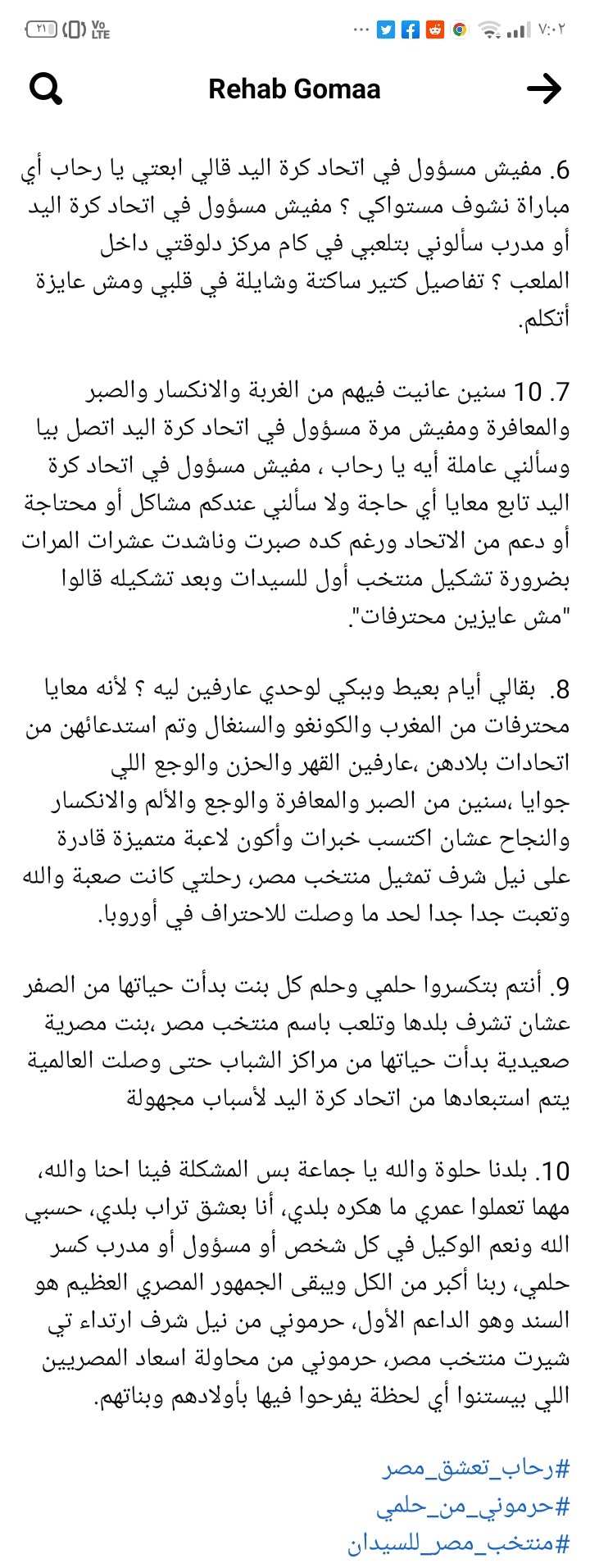 وأكدت: “مفيش مسؤول في اتحاد كرة اليد قالي ابعتي يا رحاب أي مباراة نشوف مستواكي؟ مفيش مسؤول في اتحاد كرة اليد أو مدرب سألوني بتلعبي في كام مركز دلوقتي داخل الملعب؟ تفاصيل كتير ساكتة وشايلة في قلبي ومش عايزة أتكلم”.