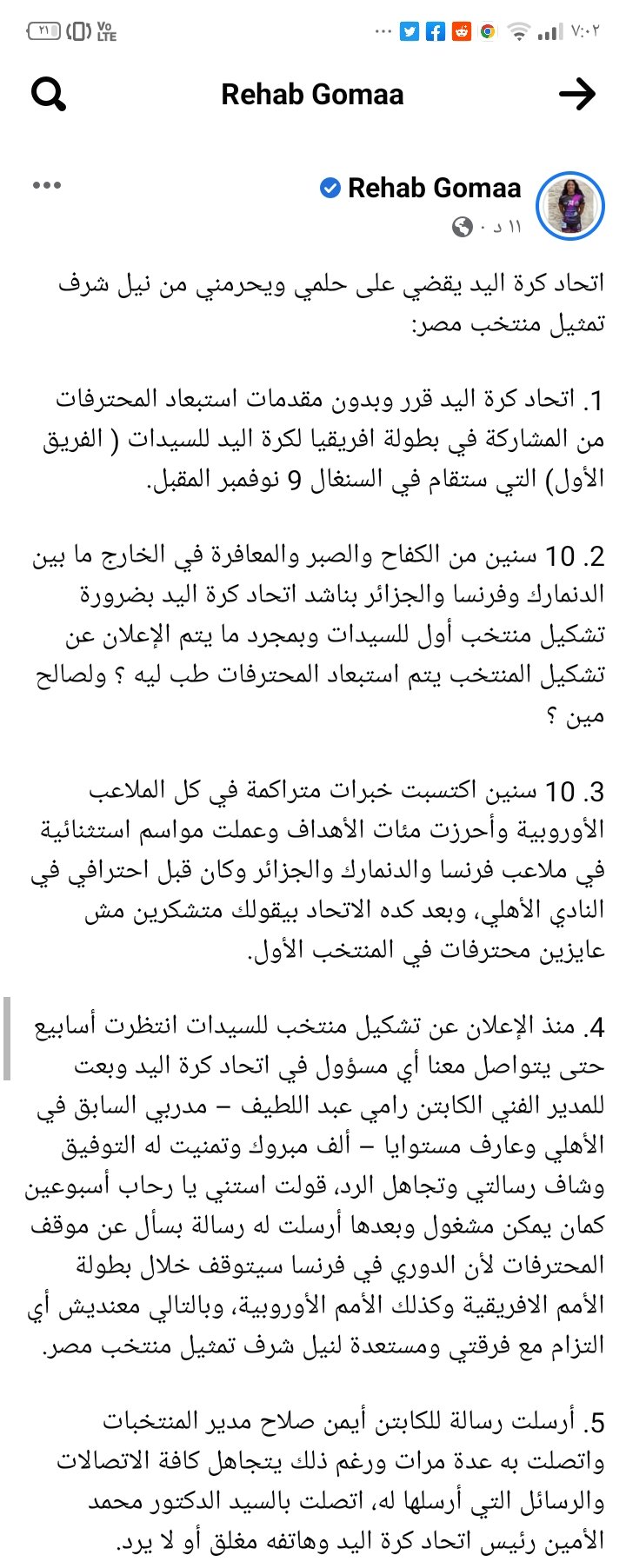 وتابعت: “10 سنين من الكفاح والصبر والمعافرة في الخارج ما بين الدنمارك وفرنسا والجزائر، بناشد اتحاد كرة اليد بضرورة تشكيل منتخب أول للسيدات، وبمجرد ما يتم الإعلان عن تشكيل المنتخب يتم استبعاد المحترفات؟، طب ليه ؟ ولصالح مين؟”.