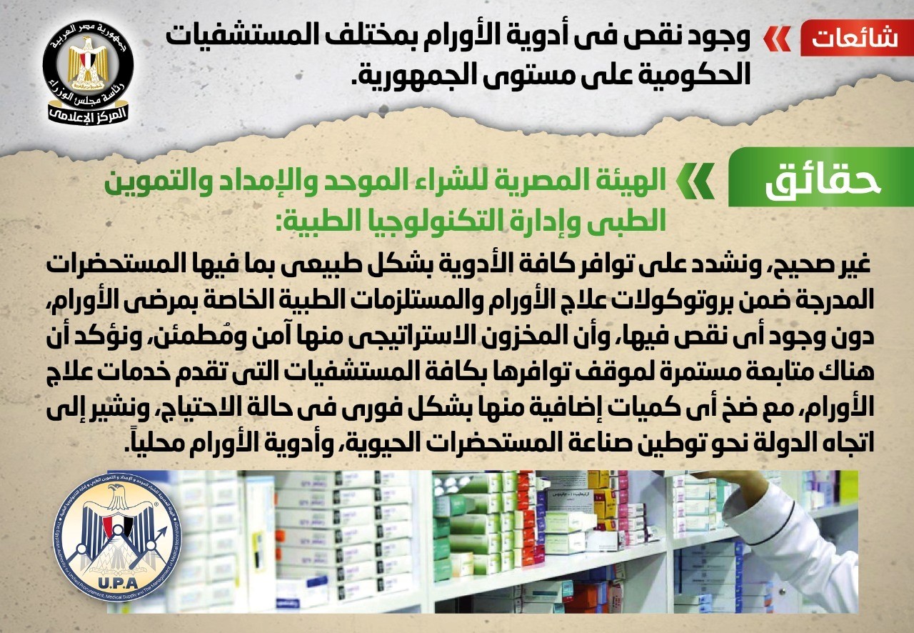 تداولت بعض المواقع الإلكترونية وصفحات التواصل الاجتماعي أنباء بشأن وجود نقص في أدوية الأورام بمختلف المستشفيات الحكومية على مستوى الجمهورية، وقد قام المركز الإعلامي لمجلس الوزراء بالتواصل مع الهيئة المصرية للشراء الموحد والإمداد والتموين الطبي وإدارة التكنولوجيا الطبية، والتي نفت تلك الأنباء، مُؤكدةً أنه لا صحة لوجود نقص في أدوية الأورام بمختلف المستشفيات الحكومية على مستوى الجمهورية.