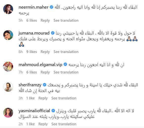 وكتبت جومانا مراد «لا حول ولا قوة الا بالله ، البقاء لله يا حبيبتي ربنا يرحمه ويغفر له ويجعل مثواه الجنة و يصبرك ويربط على قلبك»، فيما كتب شريف رمزي «البقاء لله شدي حيلك يا أمينة وربنا يصبركم و يجمعك بيه في الجنة إن شاء الله»