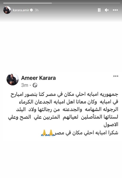 وكتب «كرارة» قائلًا: «جمهورية إمبابة أحلى مكان في مصر، كنا امبارح في إمبابة وكان معانا أهل امبابة الجدعان الكرماء الرجولة الشهامة والجدعنة من رجالتها ولاد البلد لستاتها المتأصلين لعيالهم المتربيين على الصح وعلى الأصول».