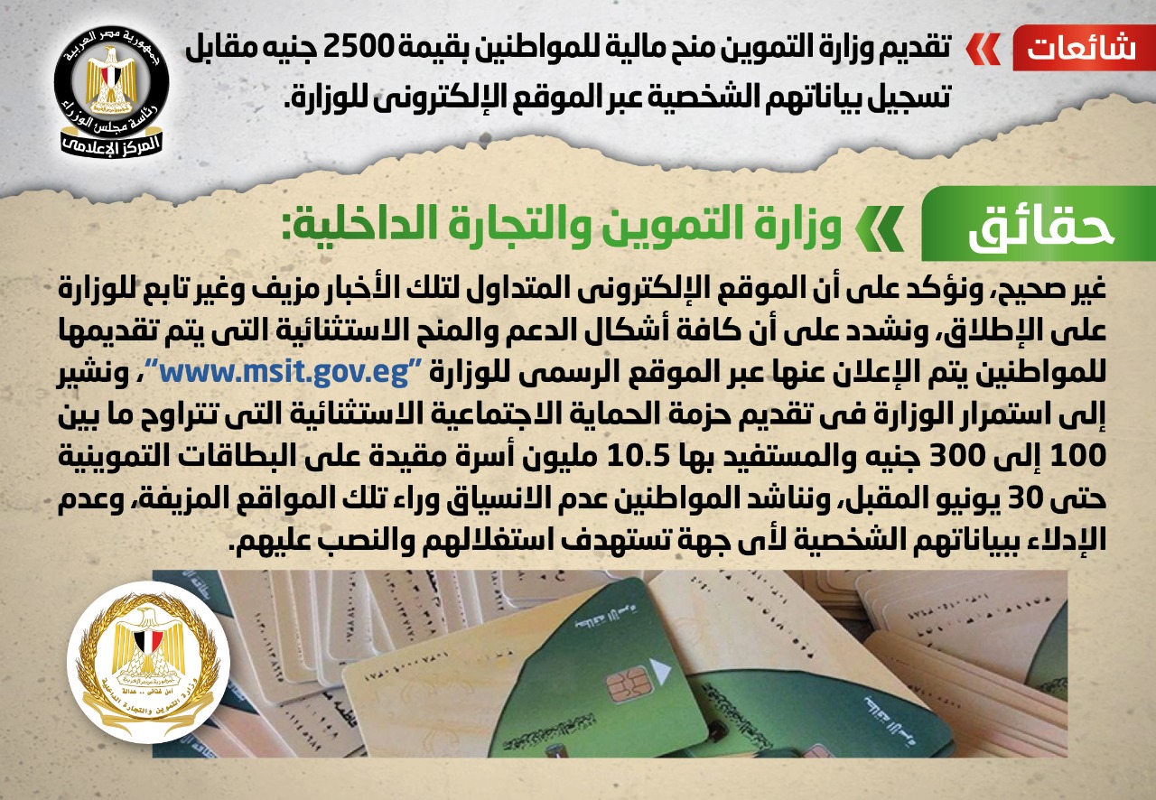 كشف المركز الإعلامي لمجلس الوزراء إنه في ضوء ما تردد من أنباء بشأن تقديم وزارة التموين منح مالية للمواطنين بقيمة 2500 جنيه مقابل تسجيل بياناتهم الشخصية عبر الموقع الإلكتروني للوزارة، تواصل المركز مع وزارة التموين والتجارة الداخلية، والتي نفت تلك الأنباء، مُؤكدةً أنه لا صحة لتقديم منح مالية للمواطنين بقيمة 2500 جنيه مقابل تسجيل بياناتهم الشخصية عبر الموقع الإلكتروني للوزارة.