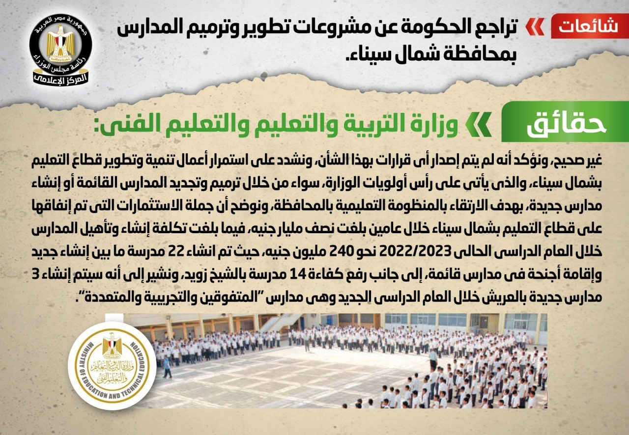 تداولت بعض المواقع الإلكترونية وصفحات التواصل الاجتماعي أنباء بشأن تراجع الحكومة عن مشروعات تطوير وترميم المدارس بمحافظة شمال سيناء، وقد قام المركز الإعلامي لمجلس الوزراء بالتواصل مع وزارة التربية والتعليم والتعليم الفني، والتي نفت تلك الأنباء، مُؤكدةً أنه لا صحة لتراجع الحكومة عن مشروعات تطوير وترميم المدارس بمحافظة شمال سيناء.