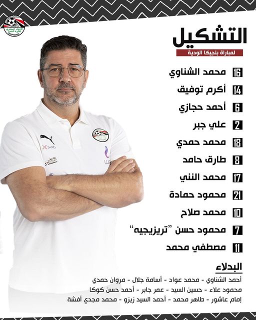 أعلن الجهاز الفني لمنتخب مصر الأول لكرة القدم بقيادة البرتغالي روي فيتوريا تشكيل ودّية بلجيكا المقرر لها الخامسة مساء اليوم باستاد جابر الاحمد الدولي وجاء كالتالي: