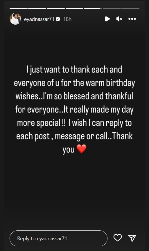واحتفل إياد نصار، أمس الأربعاء الموافق 9 نوفمبر بعيد ميلاده، وكتب عبر حسابه على إنستجرام: “شكرا لتهنئتكم الحارة بعيد ميلادي، أريد أشكر كل من أرسل لي رسالة أو هاتفني، شكرا لكم جميعا”.