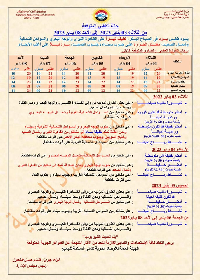 وأعلنت الهيئة توقعات طقس الـ6 أيام المقبلة، من الثلاثاء 3 يناير 2023 حتى الأحد المقبل 8 يناير.