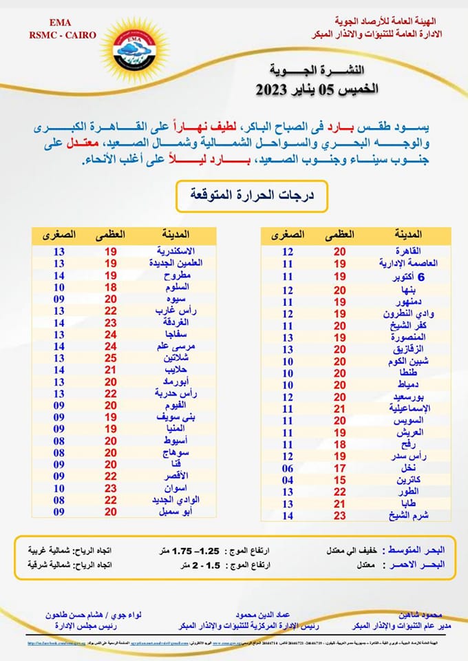 كشفت الهيئة العامة للأرصاد الجوية، تفاصيل حالة الطقس غدًا الخميس 5 يناير 2023 على كافة أنحاء الجمهورية.