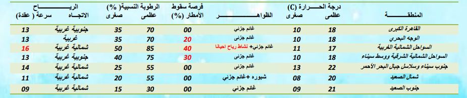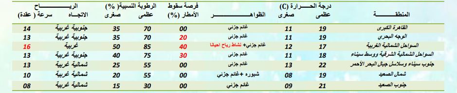 الظواهر الجوية: شبورة مائية في الصباح الباكر على بعض الطرق المؤدية من وإلى القاهرة الكبرى والوجه البحري والسواحل الشمالية ومدن القناة ووسط سيناء وشمال الصعيد. أمطار خفيفة الي متوسطة على مناطق من السواحل الشمالية وشمال الوجه البحري علي فترات متقطعة. نشاط رياح علي مناطق من السواحل الشمالية الغربية على فترات متقطعة.