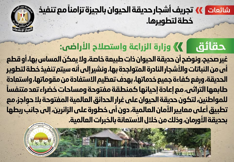 نفي المركز الإعلامي لمجلس الوزراء ما انتشر من أنباء تزعم تجريف أشجار حديقة الحيوان بالجيزة تزامناً مع تنفيذ خطة لتطويرها.
