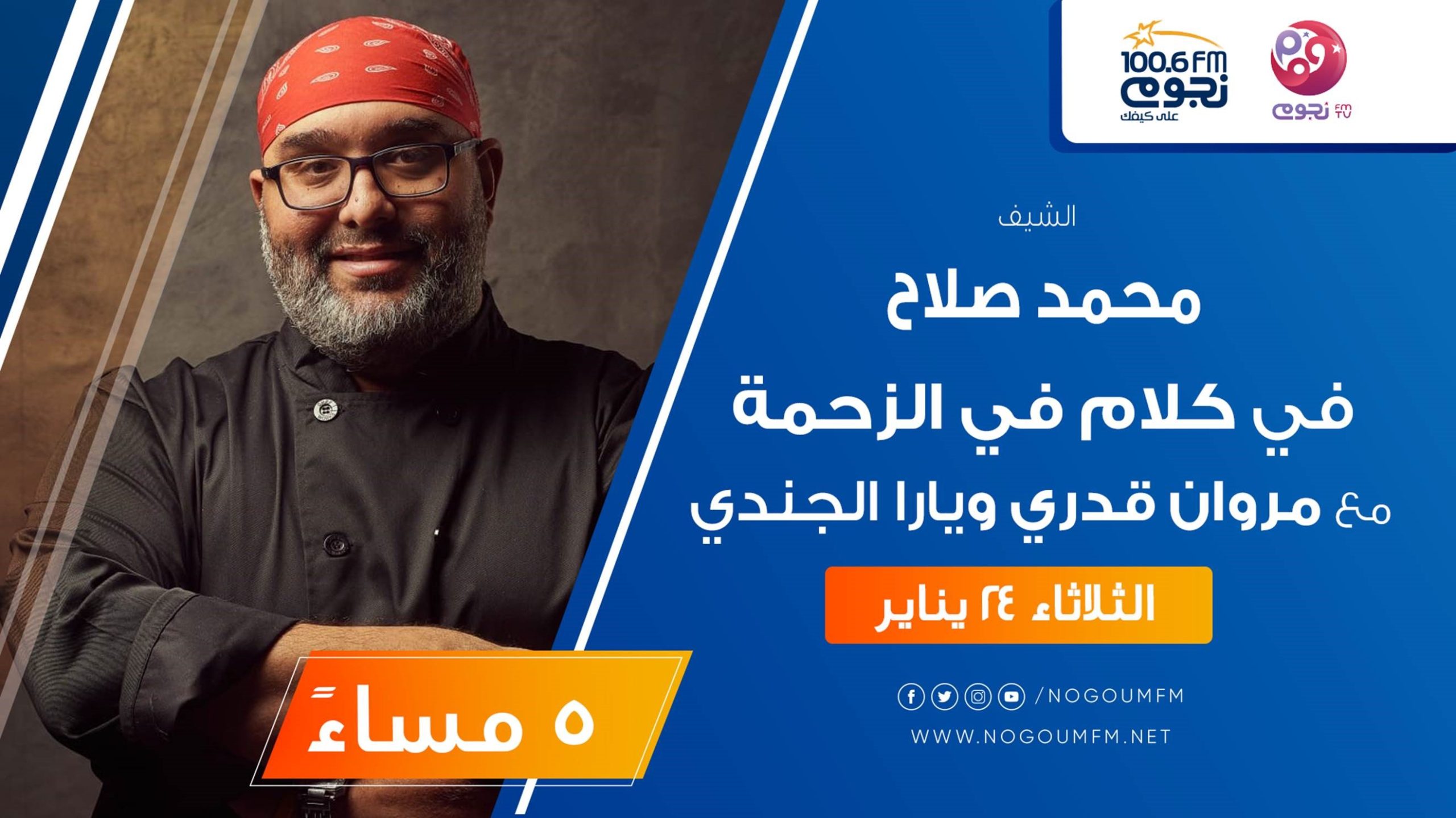 يستضيف مروان قدري ويارا الجندي، يوم الثلاثاء، 24 يناير، الشيف محمد صلاح، عبر برنامج «كلام في الزحمة»، على «نجوم إف إم»، من الساعة 5 إلى 7 مساءً.