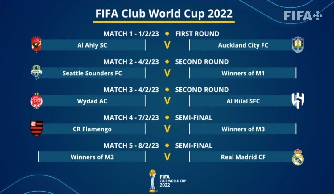 ريال مدريد (إسبانيا) – الفائز من مباراة سياتل ساوندرز (أمريكا) – الفائز من مواجهة الأهلي وأوكلاند سيتي.