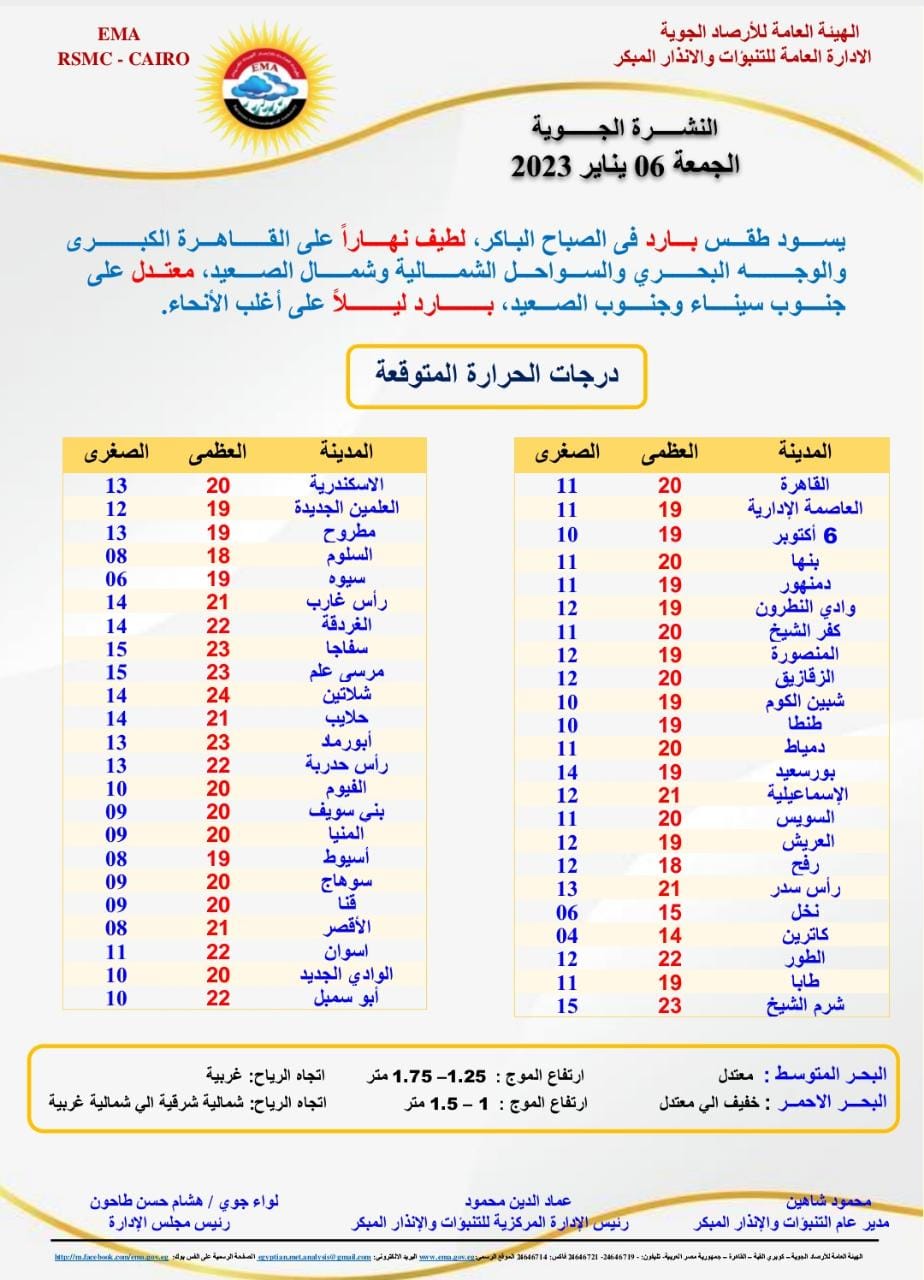 كشفت الهيئة العامة للأرصاد الجوية طقس الأيام الستة المقبلة والتي تتضمن أيام إجازات نهاية الأسبوع وإجازة عيد الميلاد المجيد يوم الأحد المقبل، حيث قالت إنه يسود طقس بارد في الصباح الباكر، لطيف نهاراً على القاهرة الكبرى والوجه البحري والسواحل الشمالية وشمال الصعيد، معتدل الحرارة على جنوب سيناء وجنوب الصعيد، بارد ليلاً على أغلب الأنحاء.