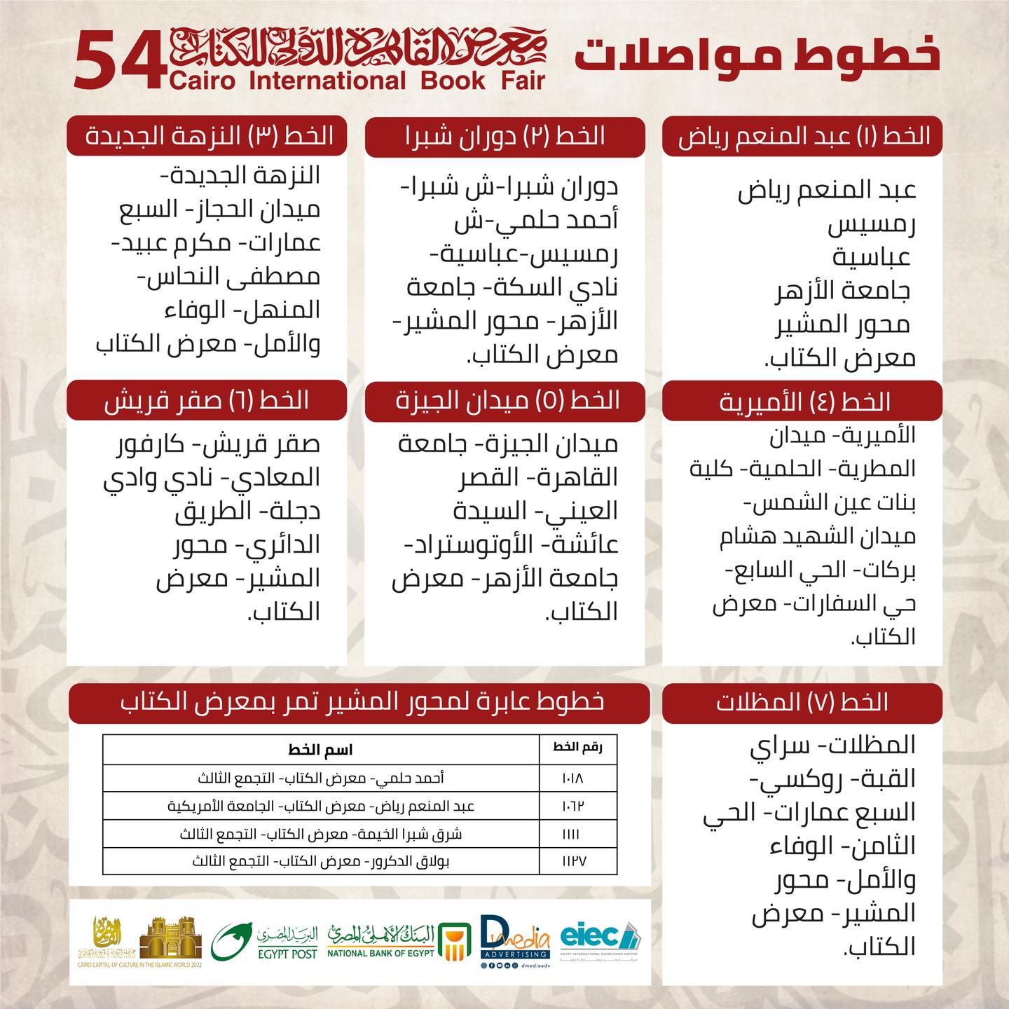 ميدان الجيزة – جامعة القاهرة – القصر العيني – السيدة عائشة – الأتوستراد – جامعة الأزهر – معرض الكتاب.
