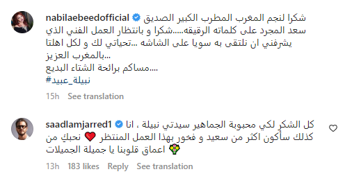 فيما ردت الفنانة نبيلة عبيد على رسالة لمجرد، وذلك عبر صفحتها على موقع “انستجرام”، قائلة: “شكرا لنجم المغرب المطرب الكبير الصديق سعد لمجرد على كلماته الرقيقة”.