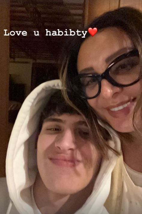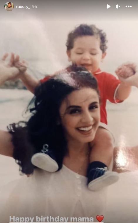 كما شارك ابنها عمر صورة له معها من طفولته وهي تحمله طفلًا وكتب «كل سنة وأنتي طيبة يا ماما».