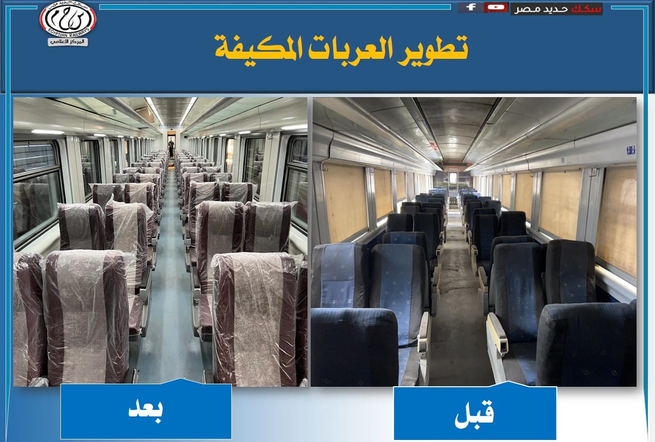 بدأت الجولة بتفقد الوزير لأحد القطارات الإسباني الجاري إعادة تأهيلها وتطويرها وتحديثها بالكامل (حيث يتم تغيير وتجديد كافة دواخل العربة من مقاعد وارضيات وشبابيك وستائر وتكييف) بالإضافة إلى دهان العربة من الخارج بشكل مميز حيث شاهد الوزير عربات من الدرجة الأولى والثانية والبوفية التي تم الانتهاء منها كما تفقد الوزير أعمال تطوير وإعادة تأهيل وتحديث القطار الإسباني الثاني ضمن خطة تطوير وإعادة تأهيل وتحديث 10 قطارات إسباني وحيث يتكون كل قطار من (عربة بوفيه -4 عربة درجة أولى و6عربات درجة ثانية ) ووجه الوزير بضرورة أن تكون كافة التشطيبات على أعلى مستوى كما وجه وزير النقل بإعادة تشغيل أول قطار إسباني تم الانتهاء من إعادة تأهيله وتطويره وتحديثه بالكامل وذلك قبل عيد الفطر المبارك على أن يتوالى تأهيل باقي القطارات الإسبانية تباعا طبقا لخطة التشغيل كما تفقد الوزير أعمال رفع كفاءة عدد من عربات تحيا مصر (عربات درجة ثالثة عادية ) حيث تم نهو رفع كفاءة 120 عربة حتى الآن من اجمالي 175 عربة جاري رفع كفائتهم بورش كوم ابوراضي وأشار وزير النقل الى أن إعادة التأهيل والتطوير والتحديث الكامل لكل قطار إسباني يهدف إلى تقديم أعلى مستويات الخدمة لجمهور الركاب.