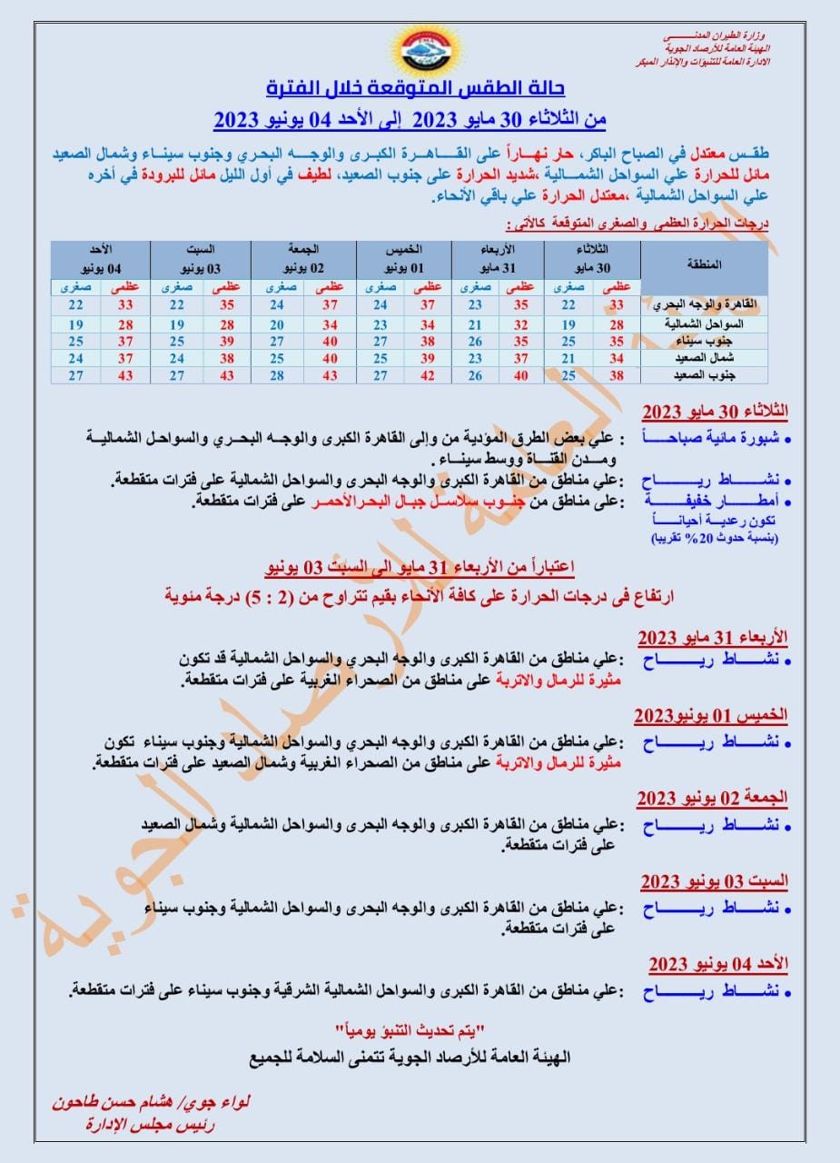 وأوضحت “الأرصاد” أن درجة الحرارة ستصل إلى 37 درجة مئوية يومي الخميس والجمعة على أغلب أنحاء القاهرة الكبرى، خلال فترة النهار، والرياح قد تكون مثيرة للرمال والأتربة يوم الخميس المقبل.