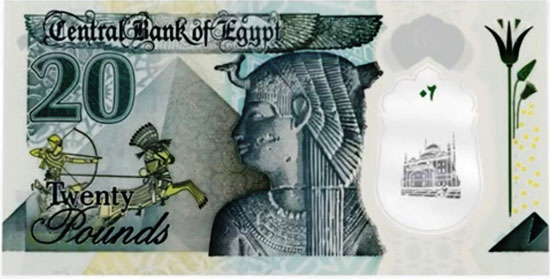 وتتسم العملة بالملس البارز لمسجد محمد علي في الوجه، ورقم 20 جنيها باللغة العربية أعلى يمين الوحدة، وكلمة عشرون جنيها منتصف الوحدة، وكذا البنك المصري المركزي.