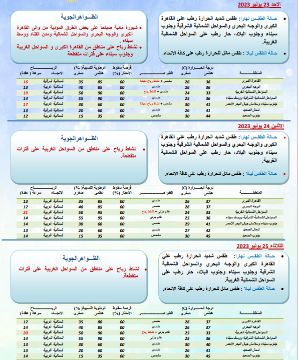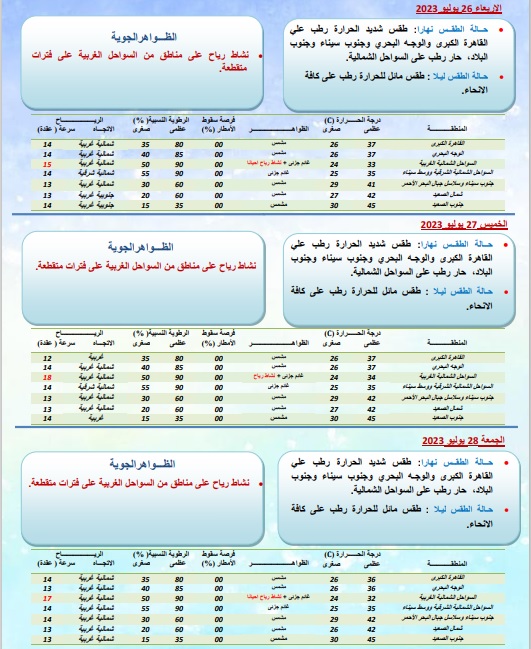 وأوضحت الهيئة أنه يستمر الارتفاع فى درجات الحرارة ، ليسود طقس مائل للحرارة فى الصباح الباكر على كافة الأنحاء ، شديد الحرارة رطب نهارا على القاهرة الكبرى والوجه البحرى والسواحل الشمالية الشرقية وجنوب سيناء وجنوب الصعيد، حار رطب على السواحل الشمالية الغربية ، مائل للحرارة رطب ليلا على كافة الأنحاء.