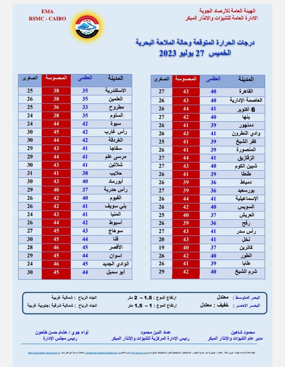 قالت هيئة الأرصاد الجوية إن اليوم الخميس ٢٧ يوليو هو ذروة الارتفاع في درجات الحرارة على كافة الأنحا.