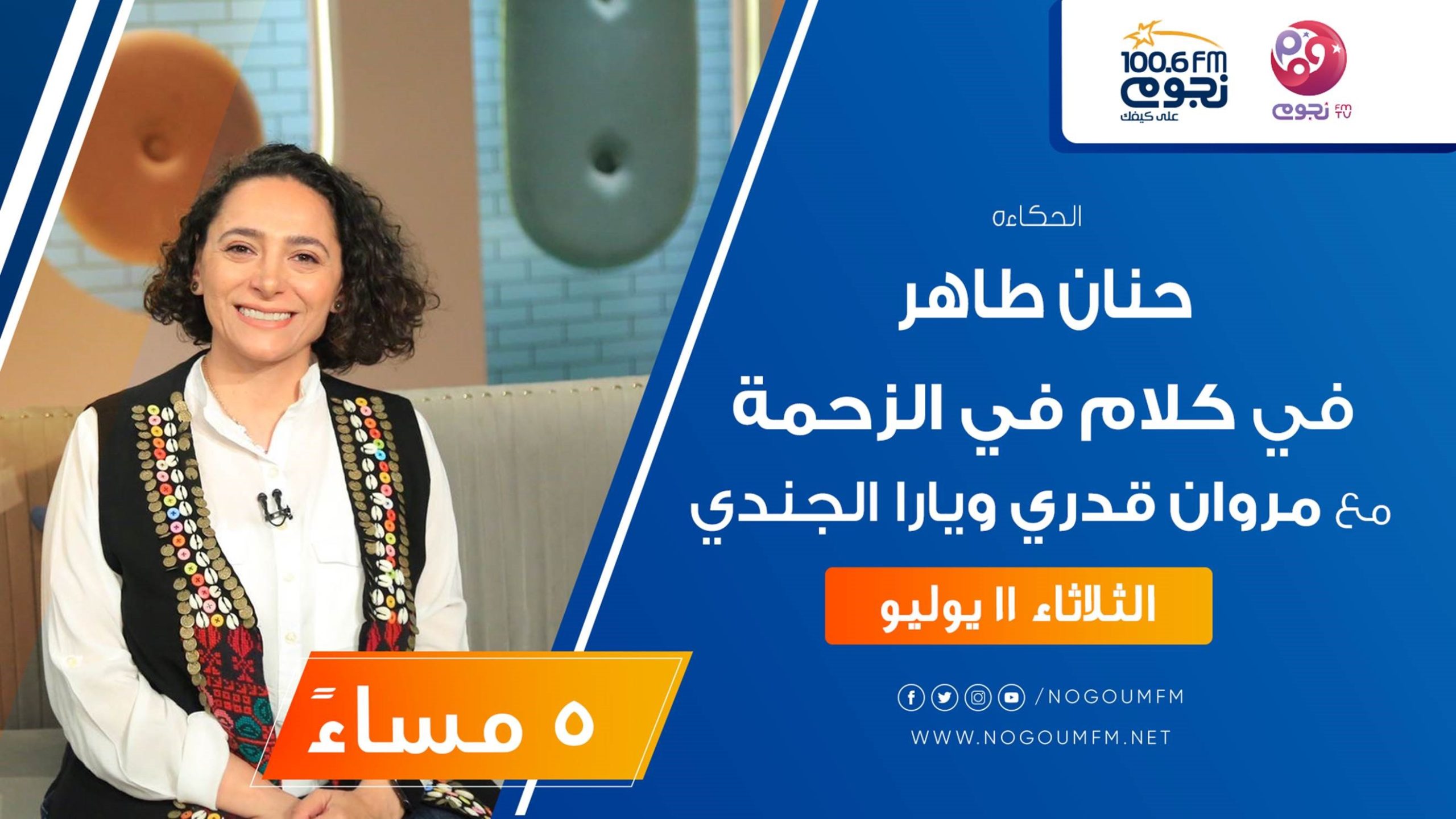 يستضيف مروان قدري ويارا الجندي، يوم الثلاثاء، 11 يوليو، الحكاءة حنان طاهر، عبر برنامج «كلام في الزحمة»، على «نجوم إف إم»، من الساعة 5 إلى 7 مساءً.