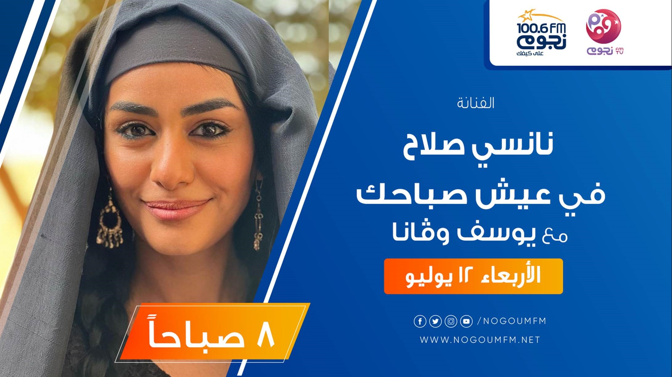 يستضيف برنامج «عيش صباحك» مع فانا إمام ويوسف التهامي، يوم الأربعاء 12 يوليو، على «نجوم إف إم»، الفنانة نانسي صلاح، للحديث عن آخر أعمالها الفنية.