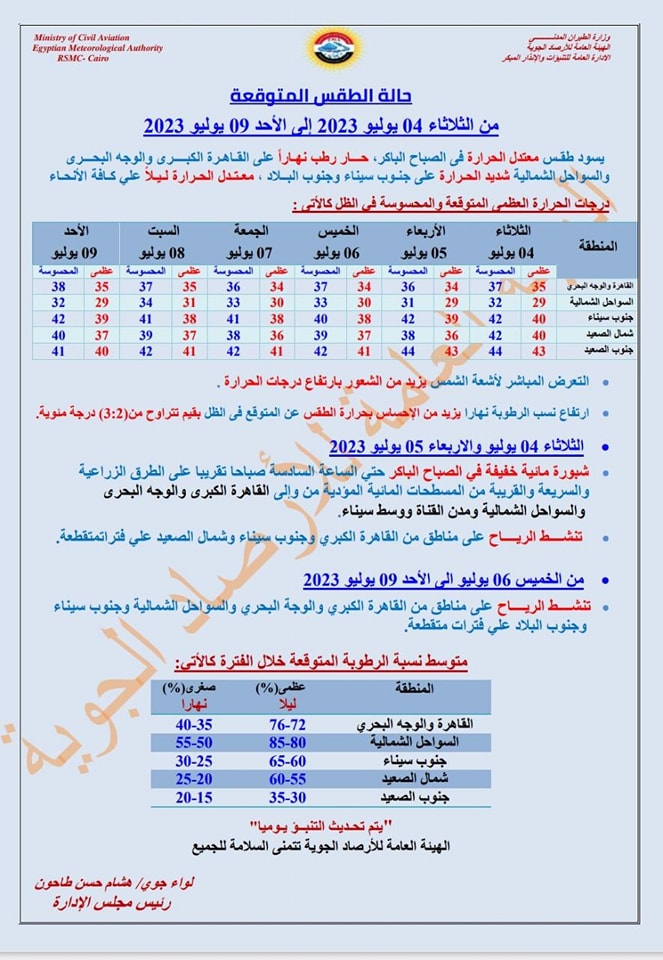 وعن درجات الحرارة تسجل القاهرة 35 درجة، و السواحل الشمالية 29 درجة و جنوب سيناء 40 درجة و شمال الصعيد 40 درجة وجنوب الصعيد 43 درجة.