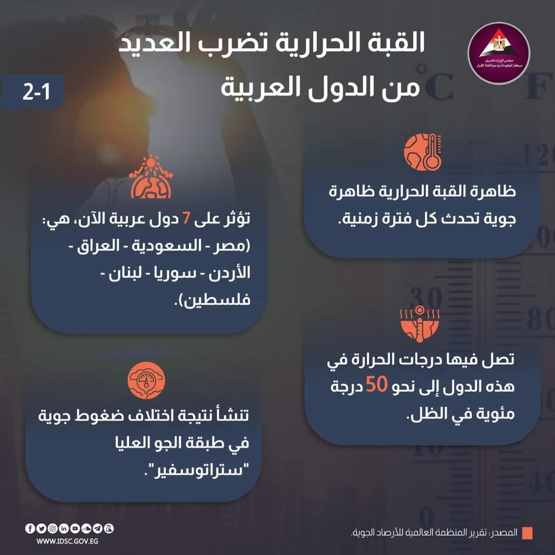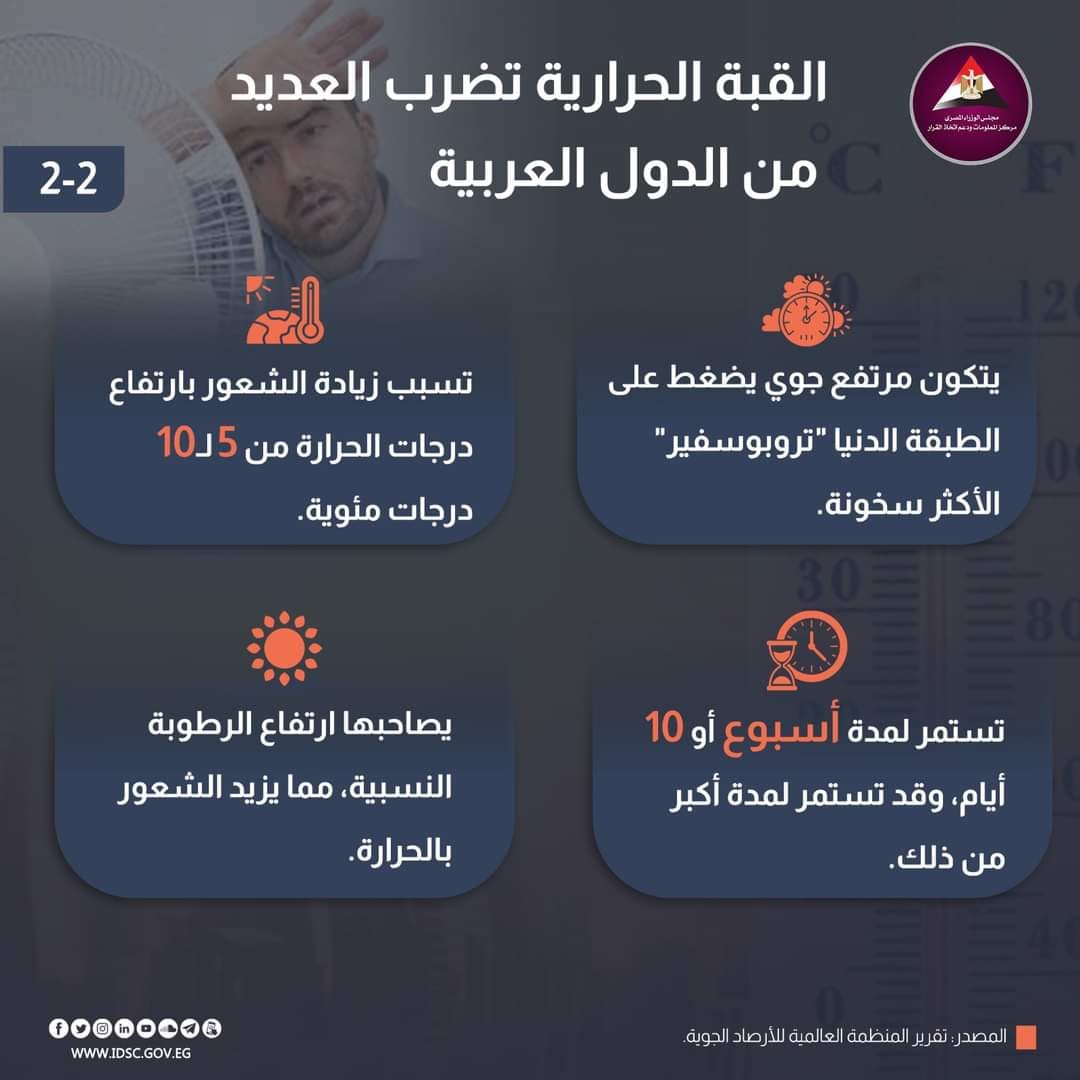 أصدر مركز المعلومات ودعم اتخاذ القرار بمجلس الوزراء معلومات عن موجة الحرارة المرتفعة التي تمر بها مصر والمنطقة خلال الفترة الحالية.