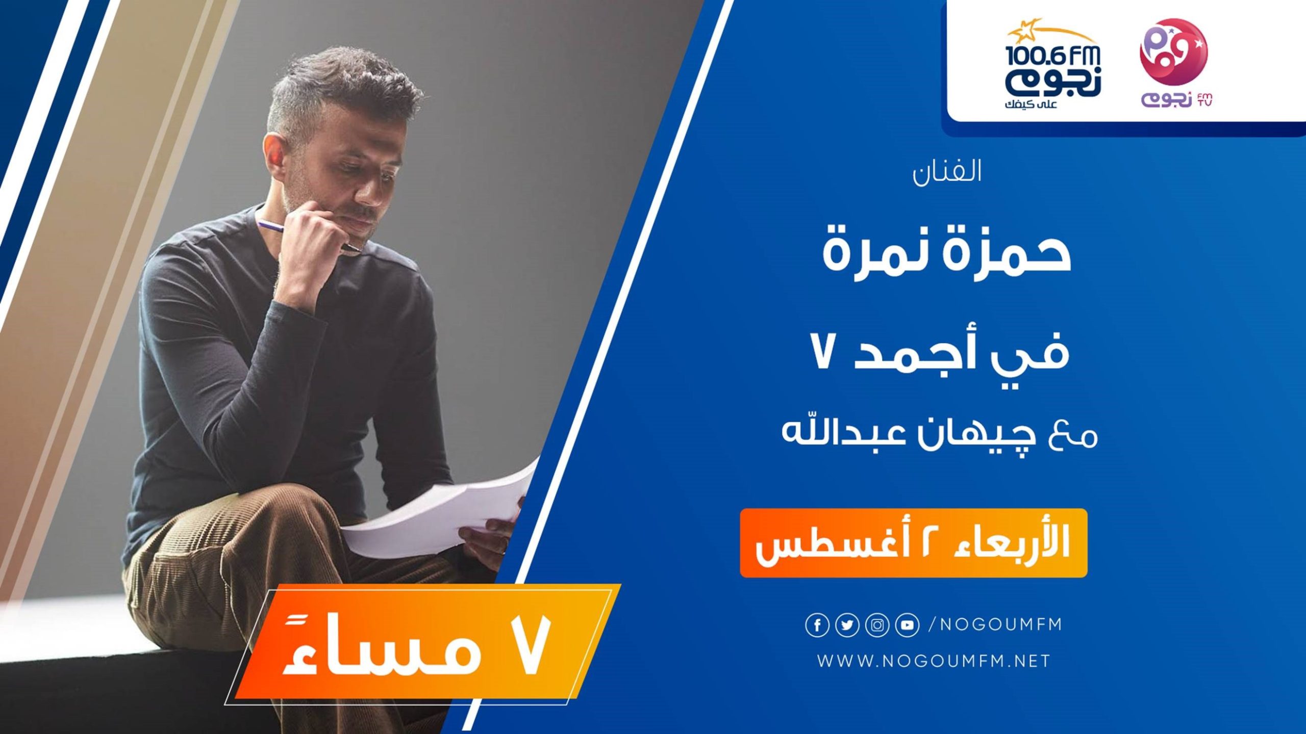 يحل الفنان حمزة نمرة ضيفًا على برنامج «أجمد 7» مع جيهان عبد الله، على «نجوم إف إم»، يوم الأربعاء 2 أغسطس، للحديث عن أعماله الفنية.