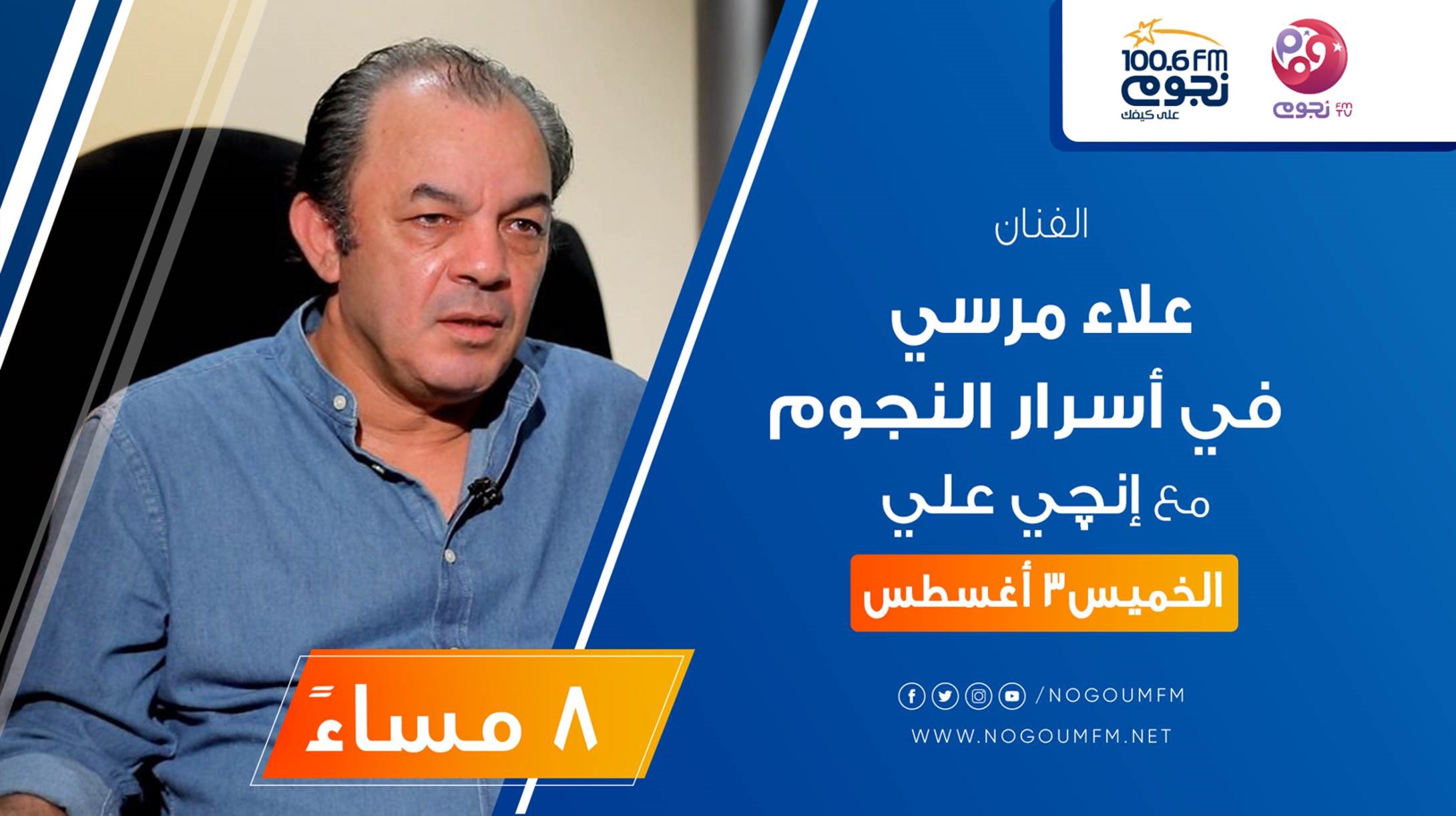 تستضيف إنجي علي في حلقة، يوم الخميس، 3 أغسطس، من برنامج «أسرار النجوم» على «نجوم إف إم»، الفنان علاء مرسي، للحديث عن آخر وأحدث أعماله الفنية.