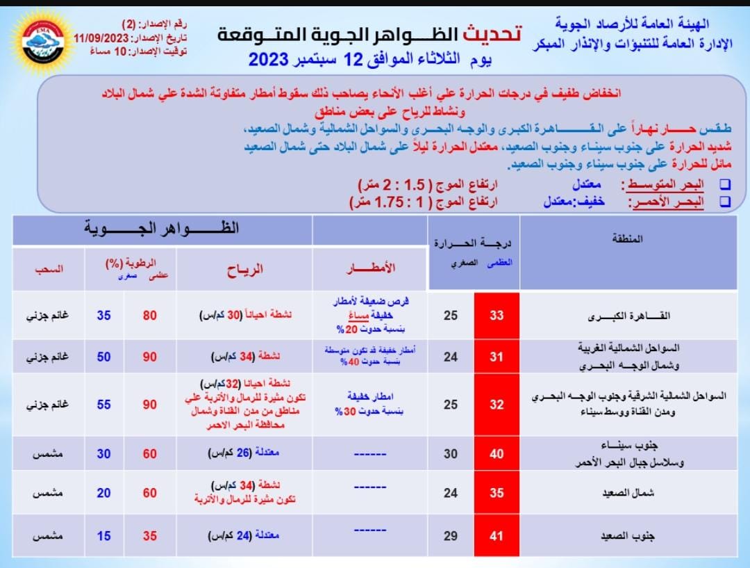 وكانت الهيئة أوضحت الظواهر الجوية ودرجات الحرارة اليوم الثلاثاء والتي جاءت كالتالي: