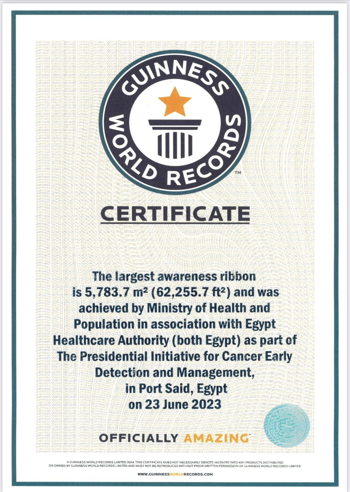 وفي بداية اللقاء، تسلم الدكتور أحمد السبكي، نسخة من شهادة موسوعة جينيس للأرقام القياسية لتسجيل أكبر علامة للتوعية بالسرطان في العالم بمصر، والتي وصلت مساحتها لـ 5783,7 مترًا مربعًا تحت اسم مبادرة رئيس الجمهورية “الكشف المبكر عن الأورام السرطانية” لدعم خدمات صحة المرأة، والتي سلمها إليه الدكتور محمد العزب، رئيس الجمعية المصرية لمنظار عنق الرحم، تقديرًا لجهود هيئة الرعاية الصحية ومشاركتها في تنفيذ المبادرة الرئاسية بمحافظة بورسعيد، ودورها الكبير في إنجاح تسجيل العلامة بموسوعة جينيس.