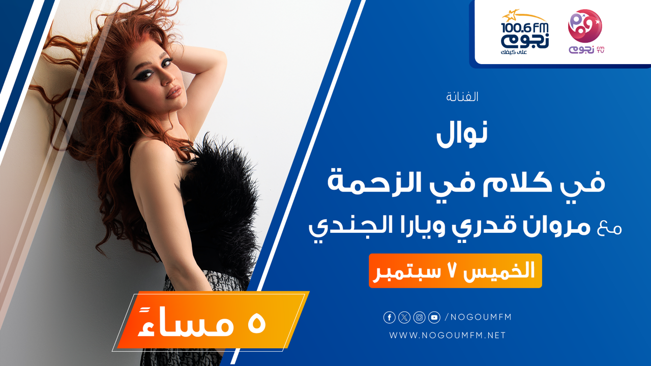 يستضيف مروان قدري ويارا الجندي، يوم الخميس، 7 سبتمبر، الفنانة نوال، عبر برنامج «كلام في الزحمة»، على «نجوم إف إم»، من الساعة 5 إلى 7 مساءً.