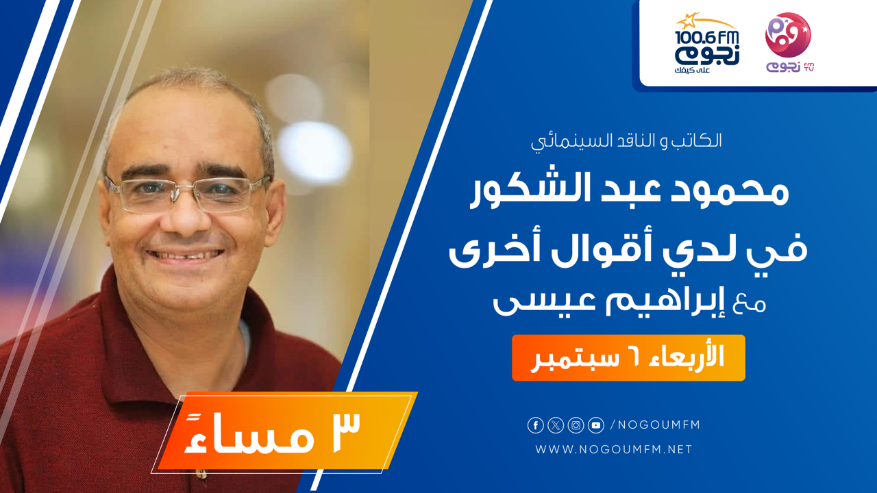 يحل الكاتب والناقد السينمائي محمود عبد الشكور ضيفًا على برنامج «لدي أقوال أخرى»، غدا الأربعاء 6 سبتمبر، مع الكاتب والإعلامي إبراهيم عيسى على «نجوم إف إم».