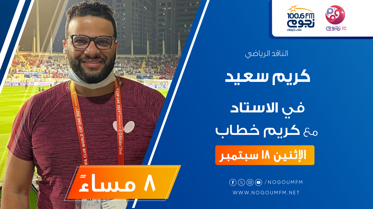 يستضيف كريم خطاب في حلقة، يوم الإثنين 18 سبتمبر، من برنامج «في الاستاد» على «نجوم إف إم»، الناقد الرياضي كريم سعيد، للحديث عن أبرز ما يدور على الساحة الرياضية الفترة الماضية.